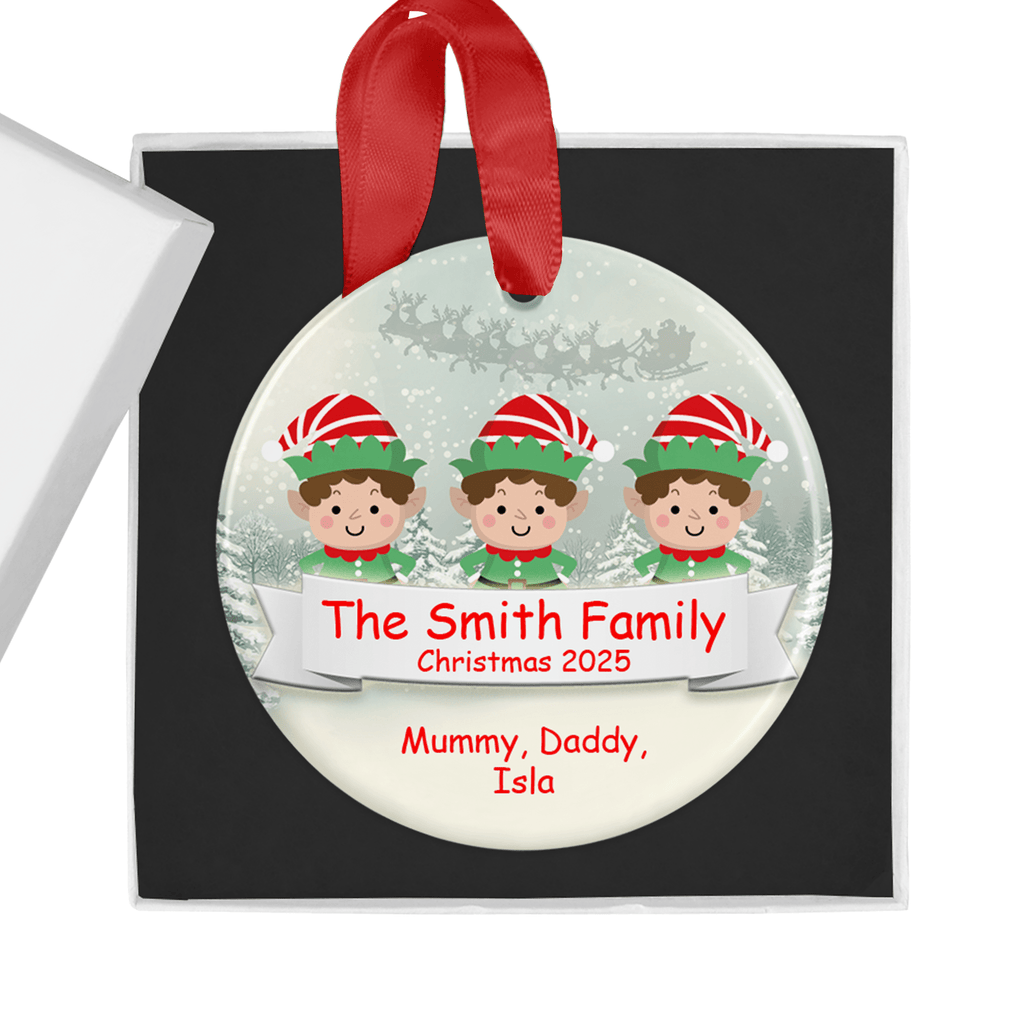 Bring festive cheer to your tree with this delightful Family Personalised Christmas Ornament featuring a playful elf family design.