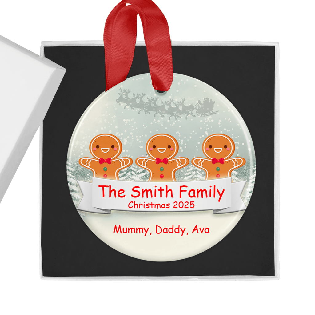 Made from premium white ceramic, this festive bauble features an adorable gingerbread family design and is personalised with your family name and up to six names, creating a keepsake that celebrates your family’s holiday season.