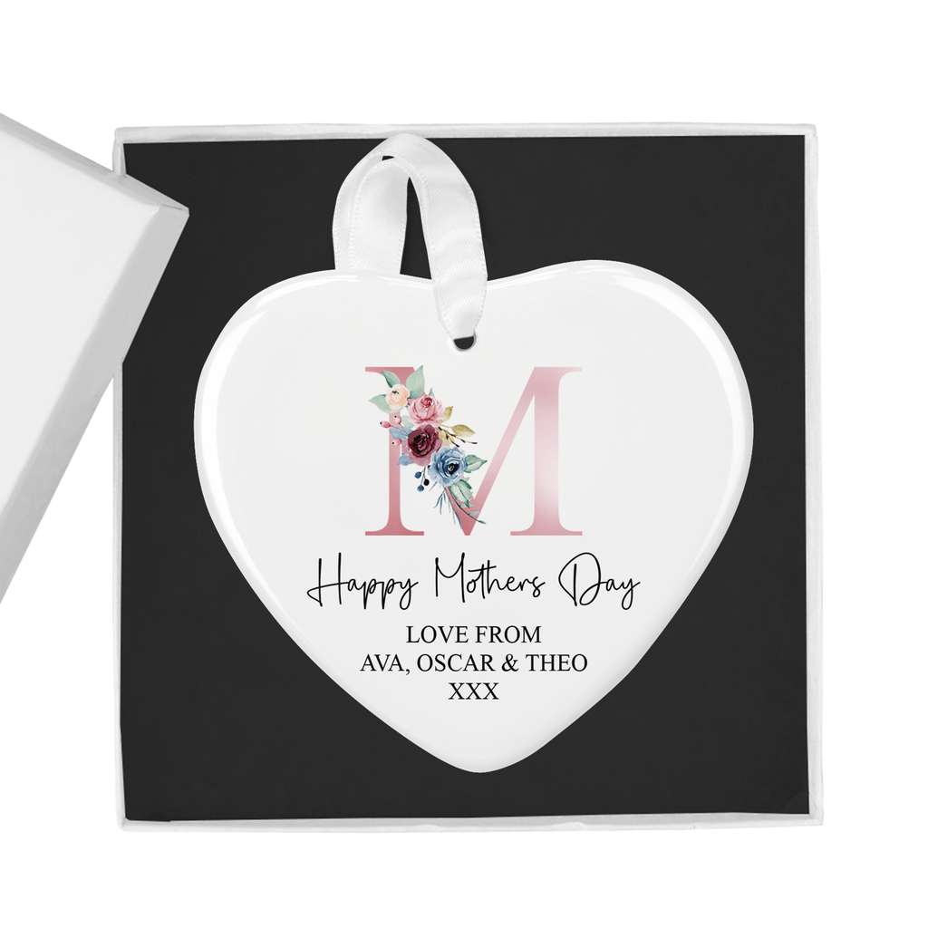 Made from premium white ceramic, this beautiful heart-shaped ornament features a soft pink floral initial design, personalised with your children’s names and finished with the message “Happy Mother’s Day”.