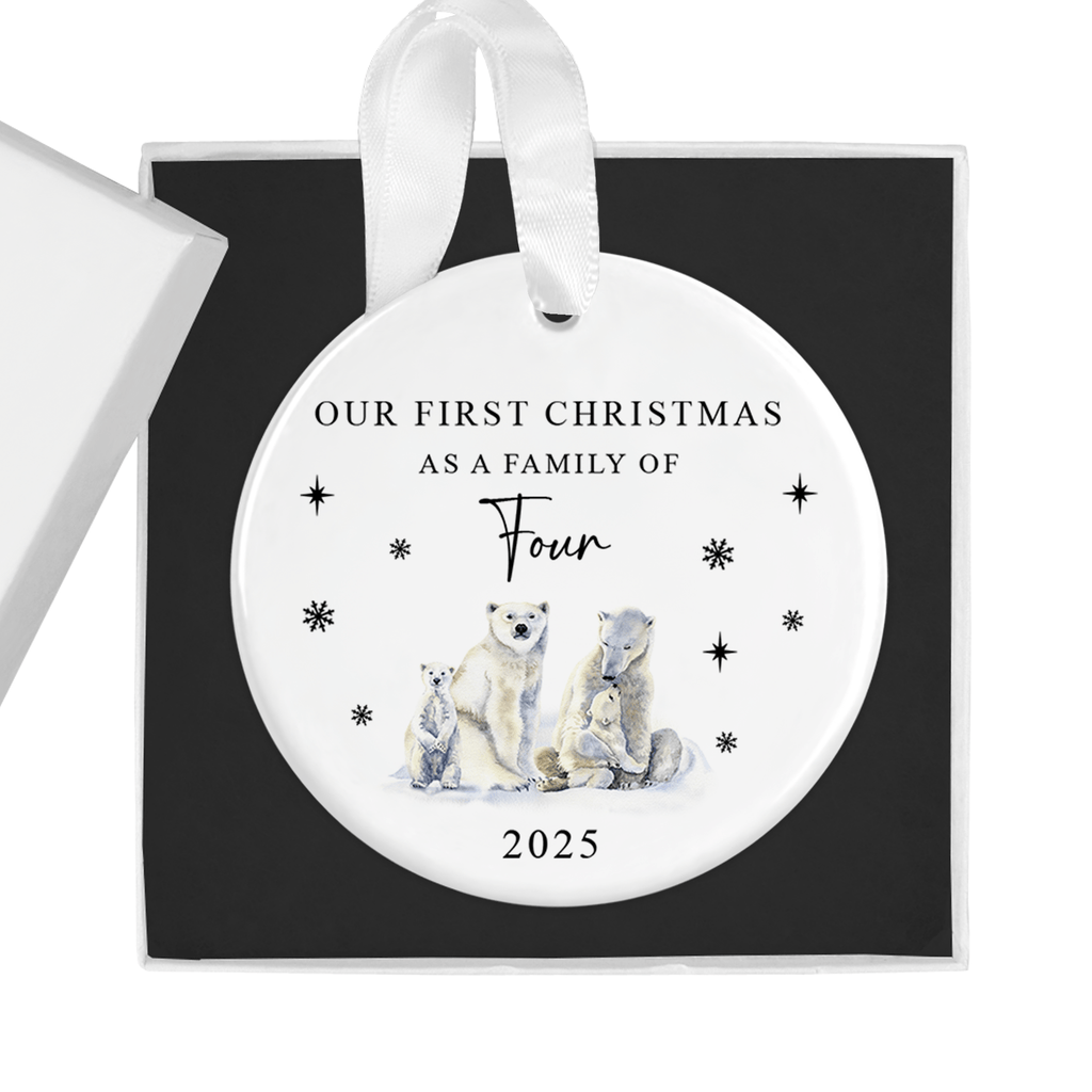 This ornament isn’t just a festive decoration—it’s a meaningful keepsake that symbolises the joy of your first Christmas as a family of four. Its classic polar bear design is timeless, making it a cherished addition to your holiday traditions.
