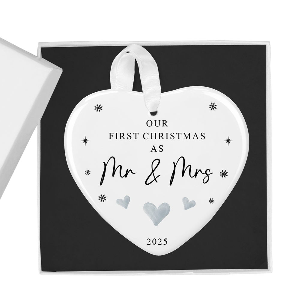 Mark the joy of your very first Christmas as Mr & Mrs with this elegant heart-shaped ceramic ornament. Designed with soft grey hearts and delicate snowflake accents, it’s a timeless keepsake that celebrates the start of your married life together.