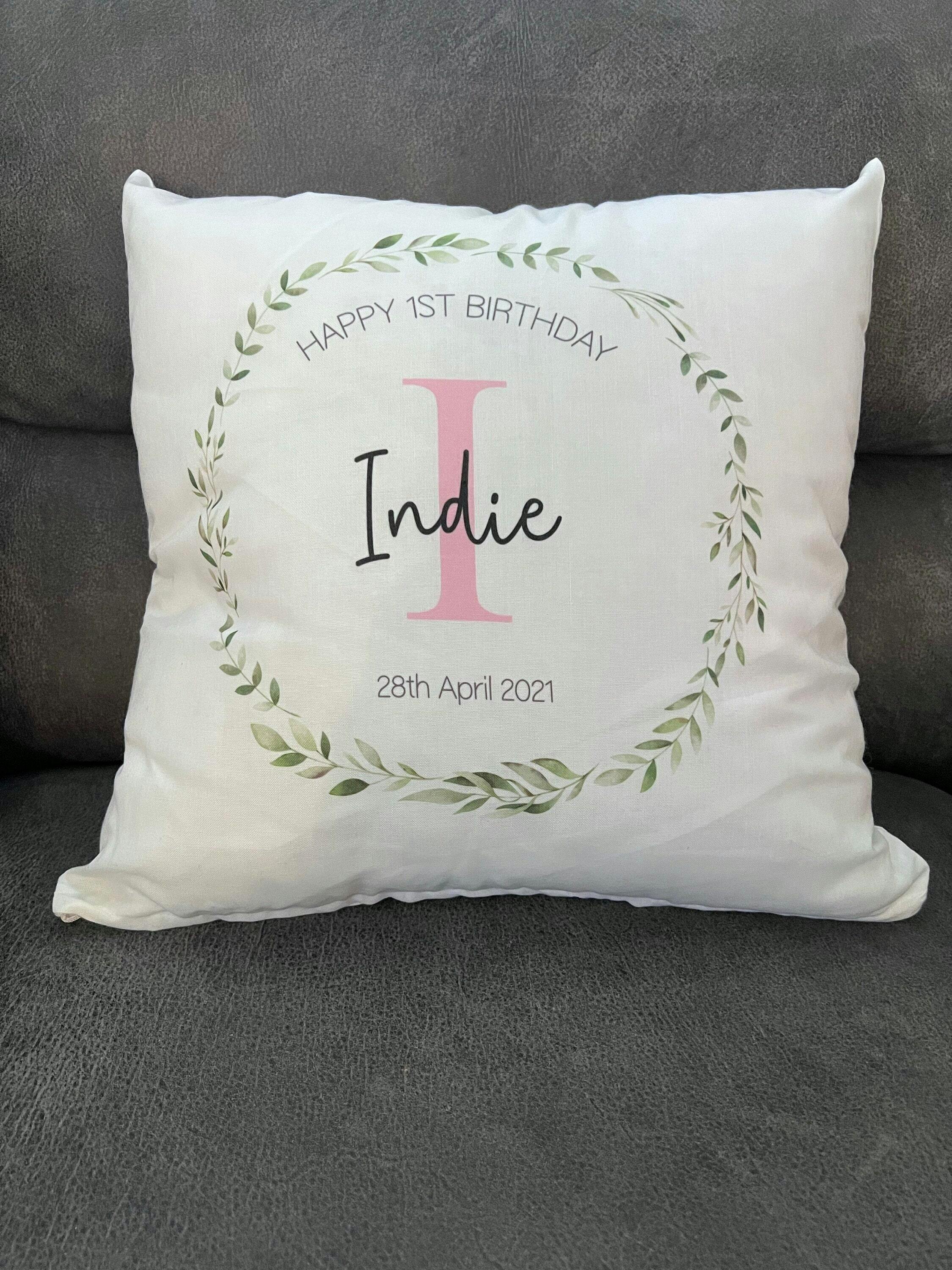 How to personalise:To personalise just enter the name and date required into the personalisation box provided.-------------------Specifications:Size: 40cm x 40cmMaterial: White PolyesterDye PrintedPrinted on one side only