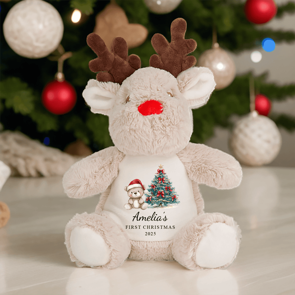 This Personalised Reindeer Teddy features an adorable teddy bear in a Santa hat next to a beautifully decorated Christmas tree, making it the perfect gift for marking a little one’s first Christmas. Crafted with soft plush fur, a classic reindeer look, and a customisable printed design, it’s a keepsake that families will treasure for years to come. Whether it’s placed under the tree, displayed in the nursery, or given as a thoughtful Christmas gift, this reindeer teddy is a heart-warming reminder of such a special milestone.