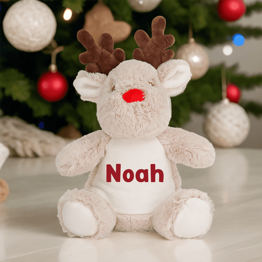 Soft, cuddly, and full of Christmas cheer, this plush reindeer is personalised with your chosen name printed clearly across its tummy — a thoughtful touch that makes it truly unique.