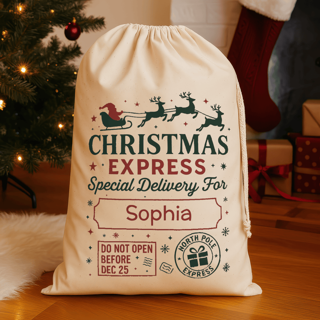 Make Christmas morning magical with our Personalised Natural Santa Sack – North Pole Express, beautifully printed with your chosen name.