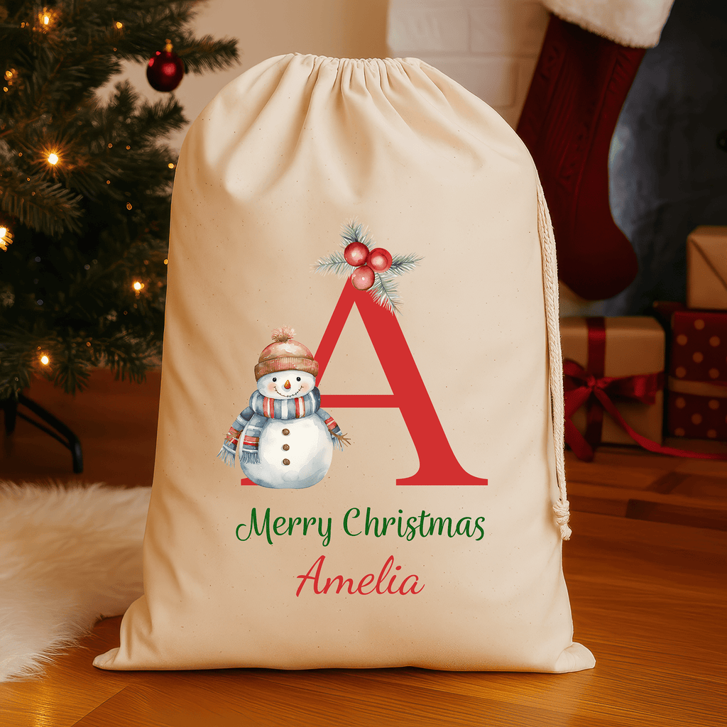 The design features a charming snowman beside your chosen initial, topped with festive holly and berries. Your child’s name is printed underneath in a stylish Christmas font, creating a keepsake that’s both personal and timeless.