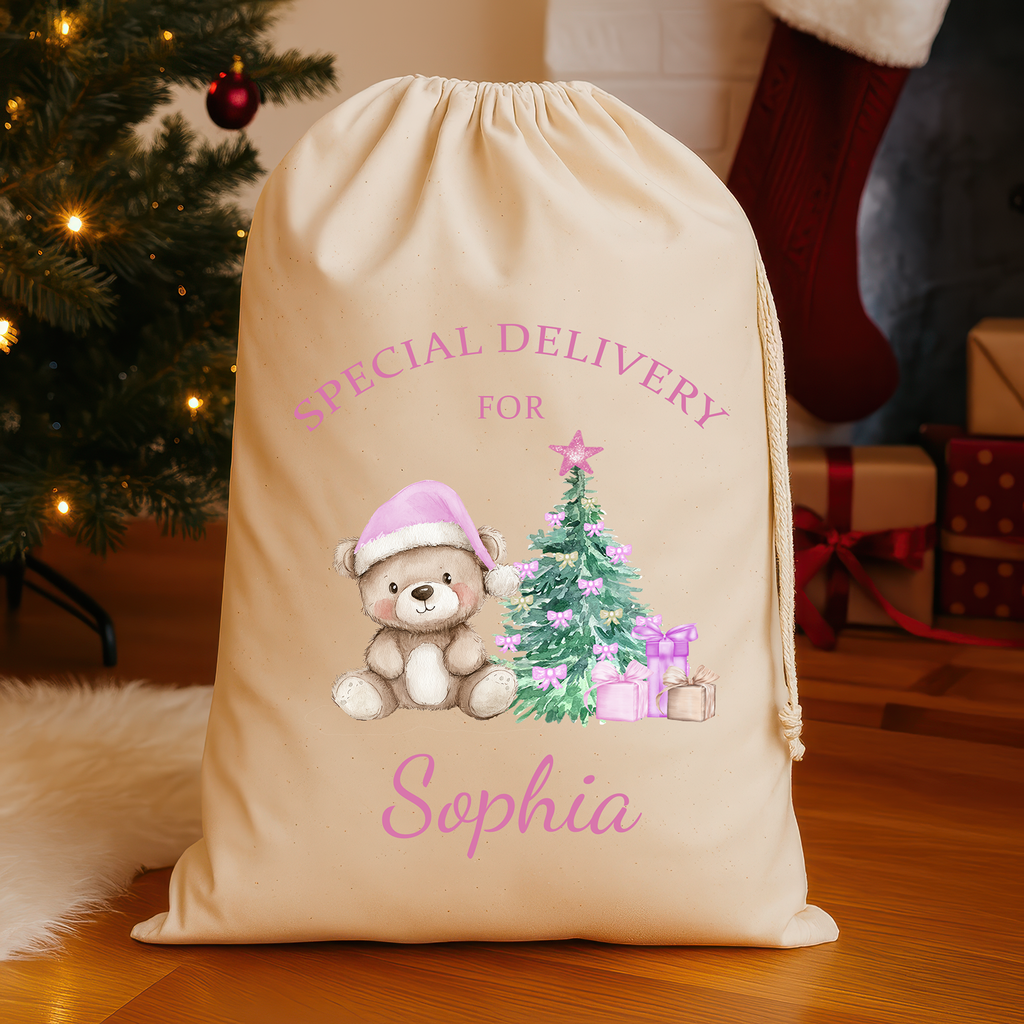 Make Christmas morning truly magical with this Personalised Pink Teddy Bear Santa Sack, printed with your chosen name for a personal touch that children will love.