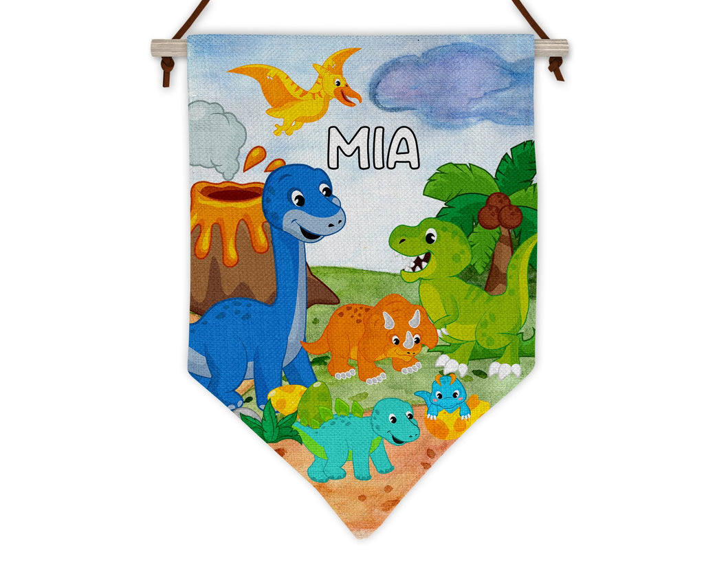 Make this dinosaur flag uniquely yours by personalizing it with your child's name or any text that connects with their love for these legendary creatures. This customized touch adds an exclusive dimension, transforming the flag into a special piece of decor or a meaningful gift for aspiring paleontologists.