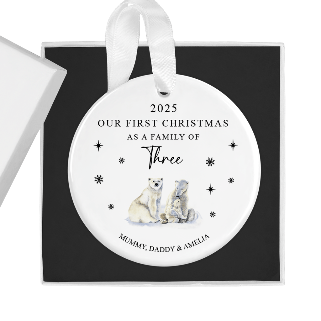 Celebrate your first Christmas together as a family of three with this beautiful personalised polar bear ornament. Featuring a charming polar bear family illustration, surrounded by festive snowflakes, this keepsake is the perfect way to mark your family’s special milestone. A heartwarming decoration to be treasured for many Christmases to come.