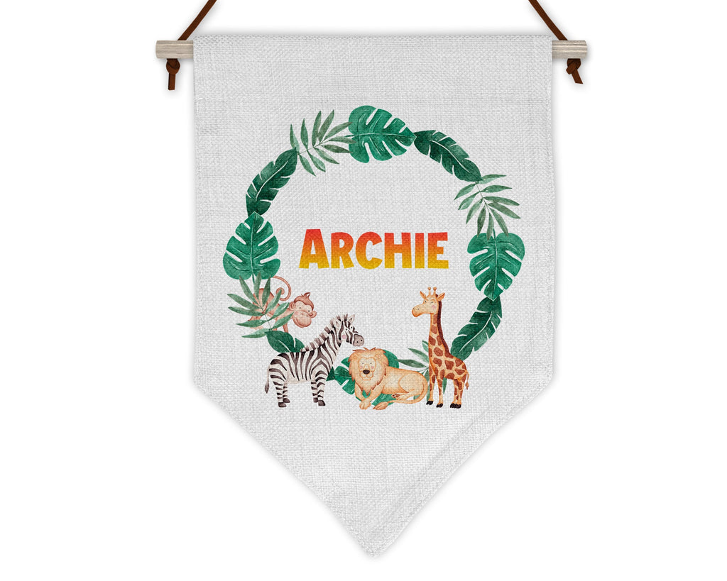 Experience the enchantment of the jungle with the Personalised Jungle Theme Linen Flag. Bring home this unique piece today and infuse your everyday life with a personalised touch of the wilderness.