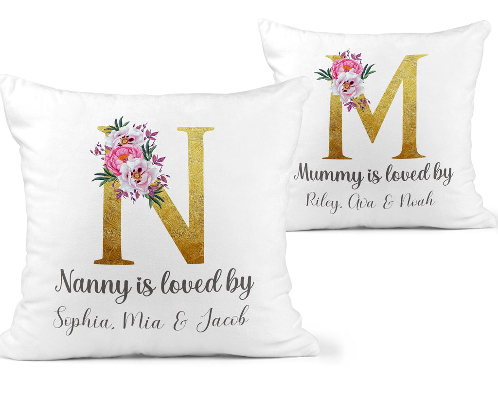 This beautiful personalised gold floral design cushion is a lovely gift that any nanny, grandma etc will love.