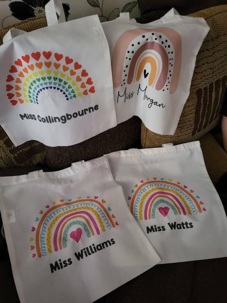 Personalised Rainbow Teacher Bag Customisable Name, Custom Leaving End of Term Gift, Teacher Tote Bag
